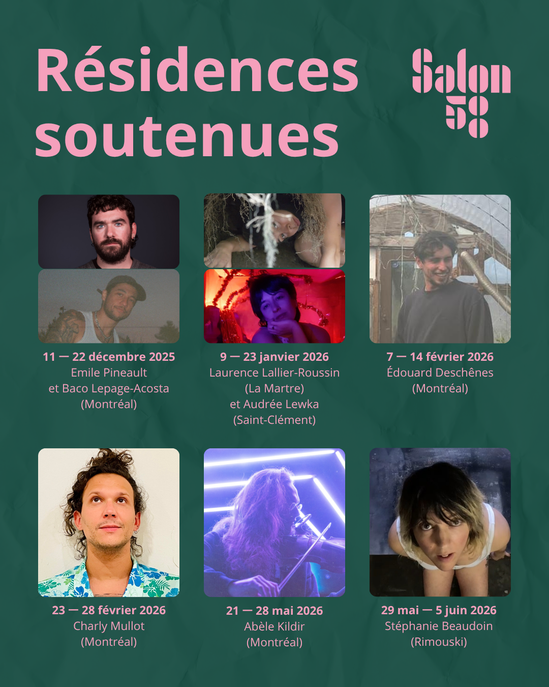 De décembre 2025 à juin 2026, sous la direction artistique de Priscilla Guy, Salon58 soutiendra donc 5 projets portés par des artistes en provenance de Montréal, Saint-Clément, Rimouski et La Martre qui œuvrent dans les milieux de la danse, de la performance, de la musique et de l’écriture.